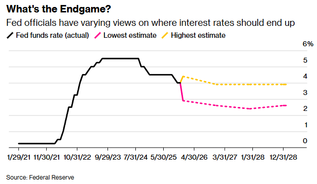 在本轮宽松周期累计降息超100个基点后,美联储官员们如今正思考应在何处停止降息,并发现彼此间的分歧比以往任何时候都更大。在过去一年左右,美联储官员对利率最终应落在何处的预测出现了至少自2012年(美联储开始公布相关估计)以来最大的分歧。这也加剧了围绕下周是否应再降息一次,以及之后应如何操作的罕见公开分裂。