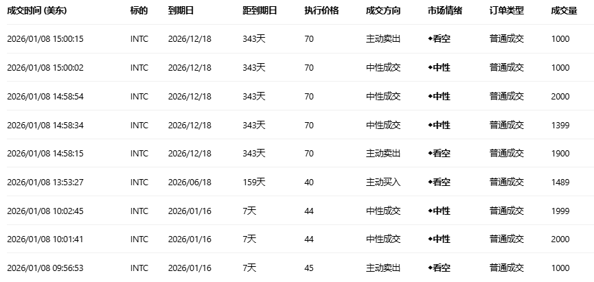 英特尔收跌3.57%,成交51.5万份期权合约,看跌/看涨成交量比升至0.41。英特尔在CES 2026发布基于18A工艺的Core Ultra Series 3处理器并与特朗普总统会面,股价创52周新高后回调,美国政府持有其10%股份成最大股东。