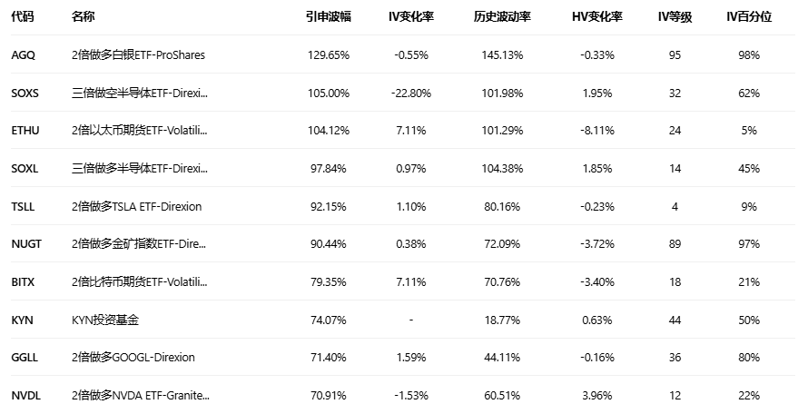 美股ETF引申波幅排行榜前十(标的要求:市值>100亿美元)