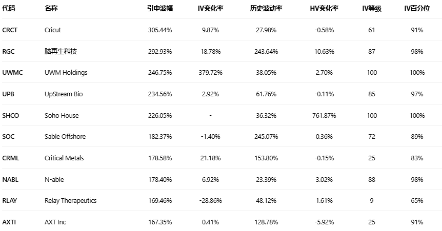 引申波幅排行榜(标的市值>10亿美元,且期权成交量>10万)