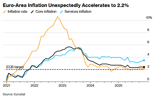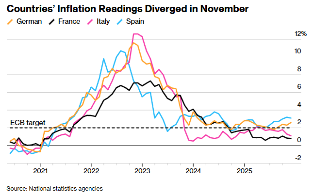 欧元区11月通胀率小幅上涨,这支持了欧洲央行的观点,即目前几乎没有理由进一步降低借贷成本。周二公布的数据显示,欧元区11月CPI同比上涨2.2%,高于经济学家预测中值2.1%和前值2.1%;剔除波动较大的食品和能源价格的核心CPI同比涨幅持平于2.4%,与经济学家预测中值一致;备受关注的服务业通胀则略有上升。
