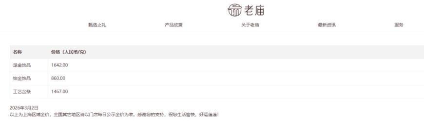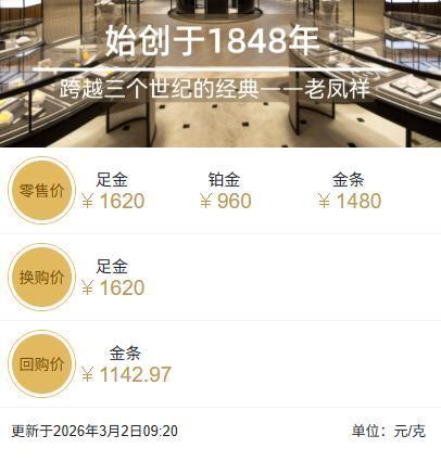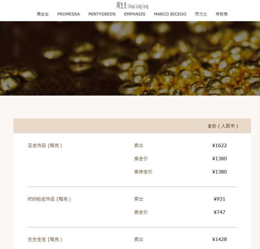 国内各品牌金饰克价大涨。周大福1629元/克,周生生1622元/克,老庙黄金1642元/克,老凤祥1620元/克。