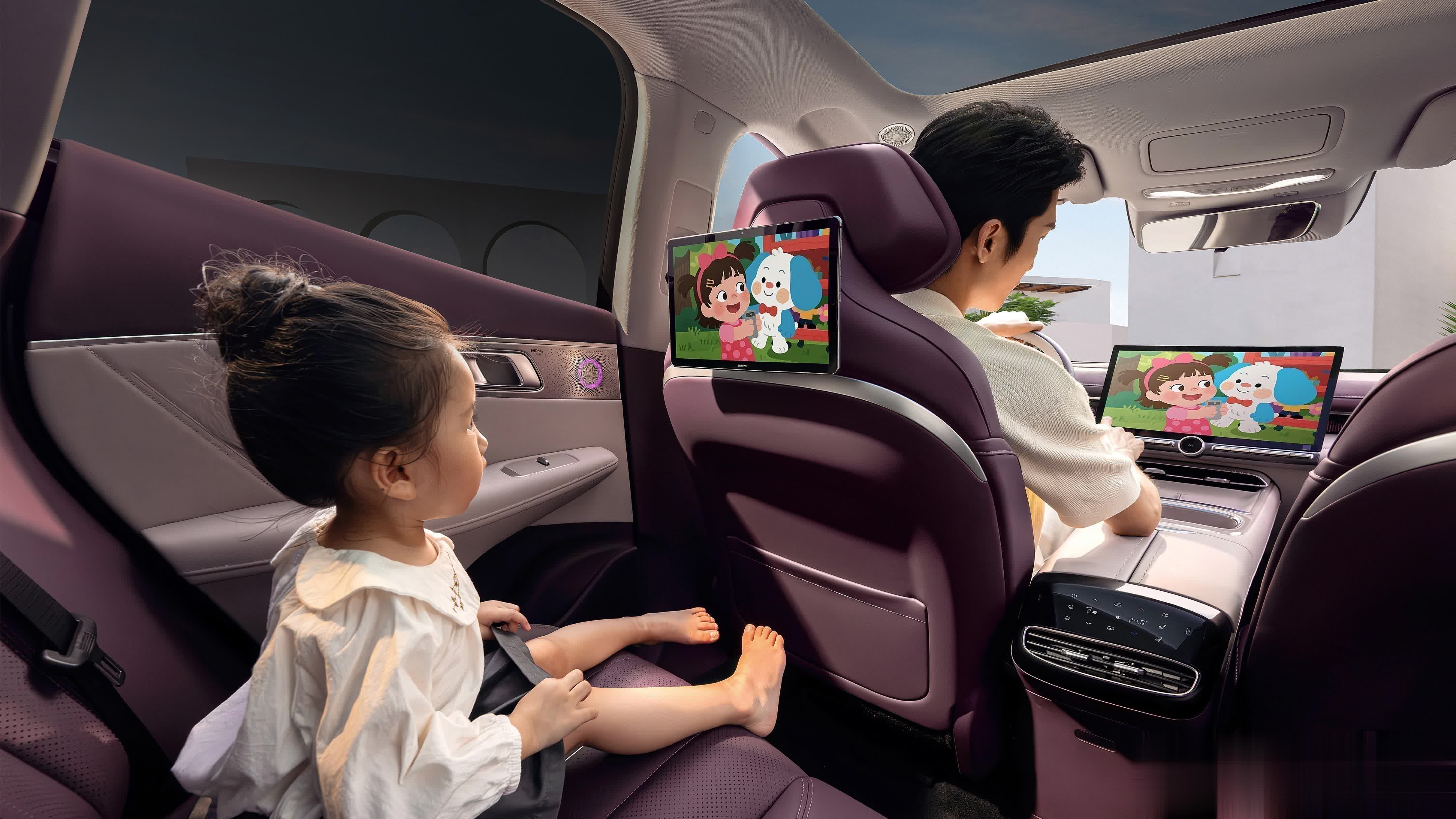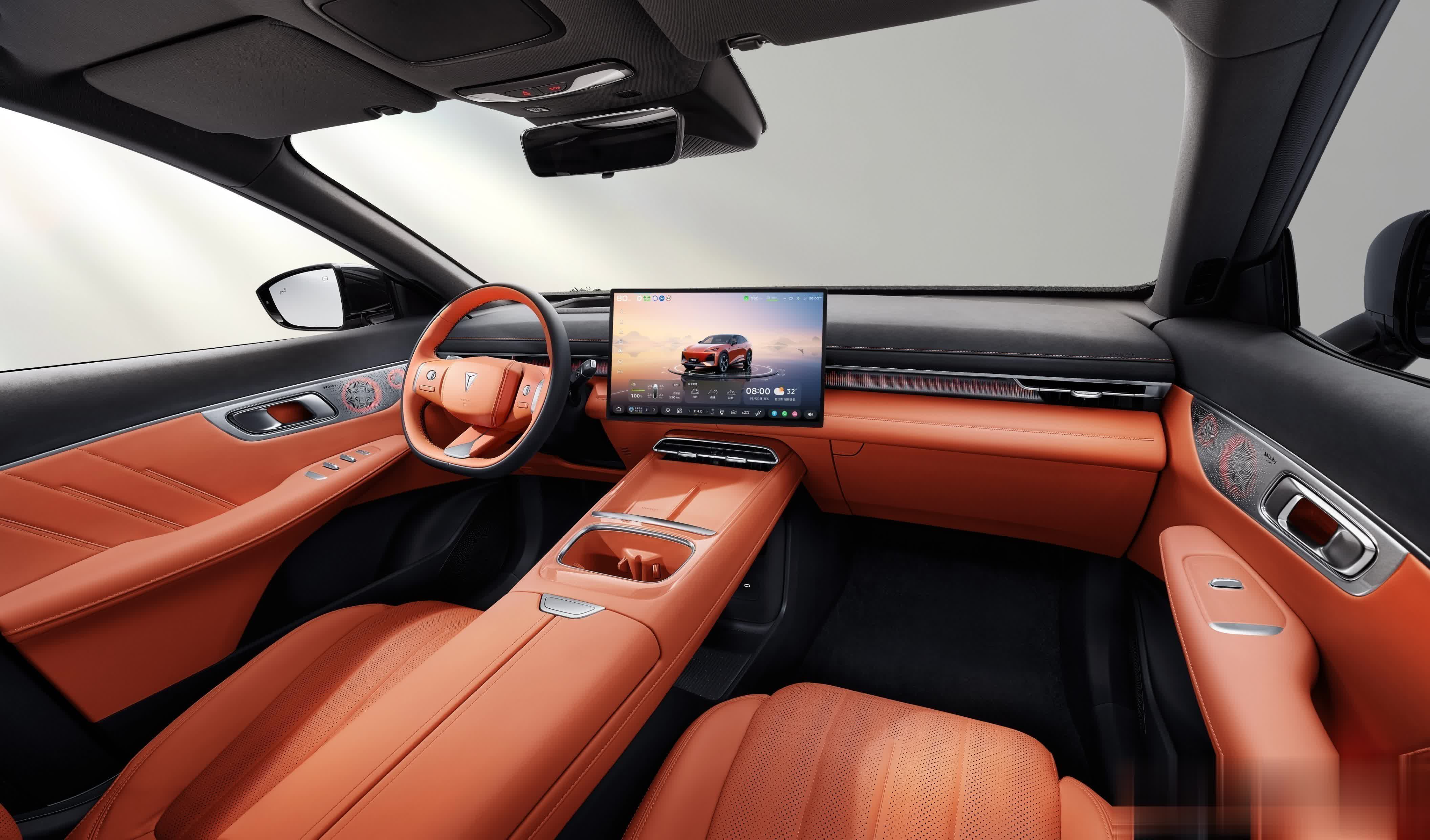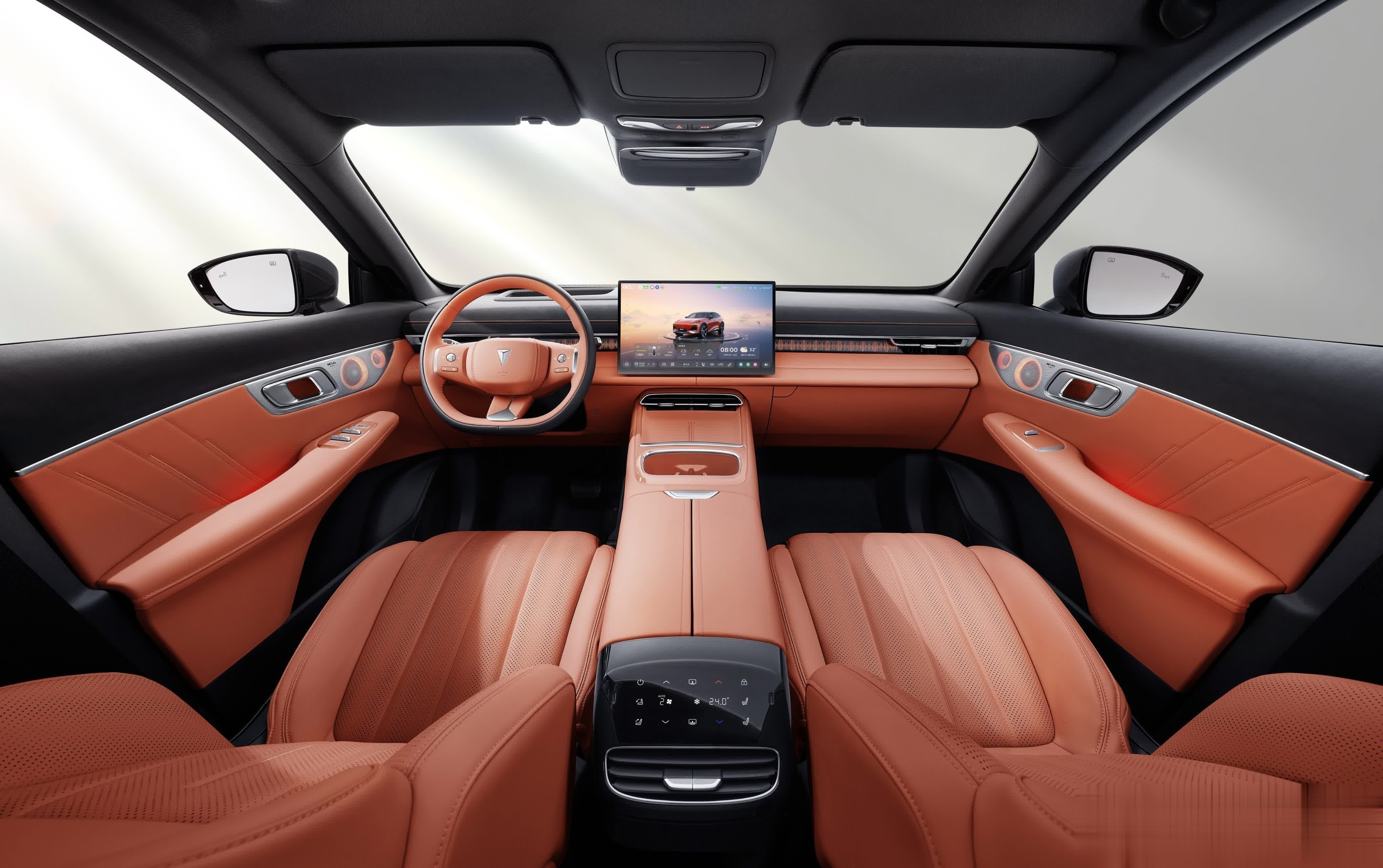 中控台采用游艇式环抱设计,大面积软包,车内有15.6英寸智能中控屏、55英寸AR-HUD全息式增强现实系统、高品质8扬声器、20扬杜比音乐厅、50W车载无线手机充电,尽显豪华感。